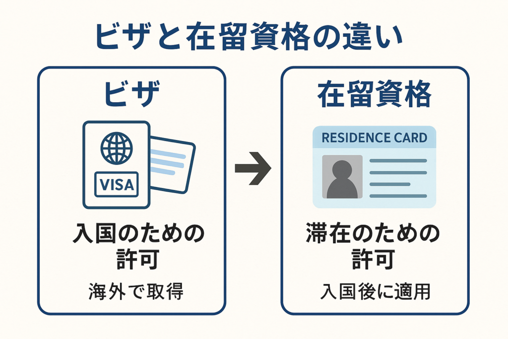 - 在留資格:日本に「滞在するための許可」。入国後に適用。